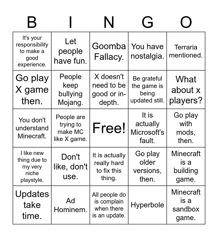 This bingo card has a free space and 24 words: Don't like, don't use., Ad Hominem., X doesn't need to be good or in-depth., Updates take time., Terraria mentioned., It's your responsibility to make a good experience., Go play X game then., Let people have fun., It is actually Microsoft's fault., It is actually really hard to fix this thing., Be grateful the game is being updated still., You don't understand Minecraft., Go play older versions, then., Minecraft is a building game., People keep bullying Mojang., Hyperbole, Go play with mods, then., Goomba Fallacy., What about x players?, People are trying to make MC like X game., Minecraft is a sandbox game., I like new thing due to my very niche playstyle., You have nostalgia. and All people do is complain when there is an update..