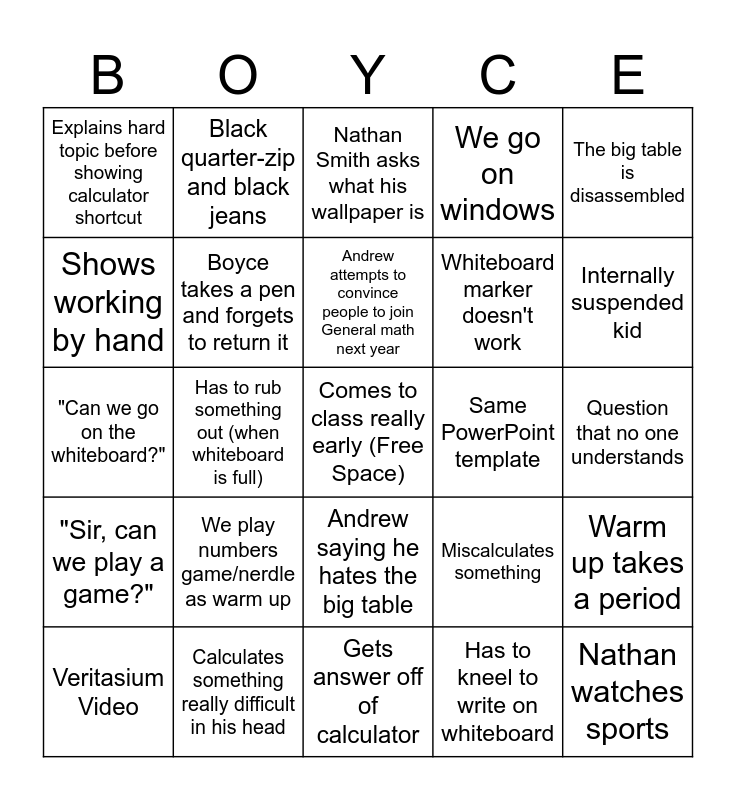 This bingo card has a free space and 27 words: Miscalculates something, Talks about a game, Whiteboard marker doesn't work, Gets answer off of calculator, Shows working by hand, Nathan Smith asks what his wallpaper is, Black quarter-zip and black jeans, "Sir, can we play a game?", Same PowerPoint template, Warm up takes a period, "Can we go on the whiteboard?", We go on windows, Veritasium Video, Calculates something really difficult in his head, Internally suspended kid, Word in textbook question that makes no sense, Boyce takes a pen and forgets to return it, Andrew attempts to convince people to join General math next year, We play numbers game/nerdle as warm up, Explains hard topic before showing calculator shortcut, Question that no one understands, Has to kneel to write on whiteboard, Has to rub something out (when whiteboard is full), Nathan watches sports, Andrew saying he hates the big table, The big table is disassembled and "Can we watch a movie?".