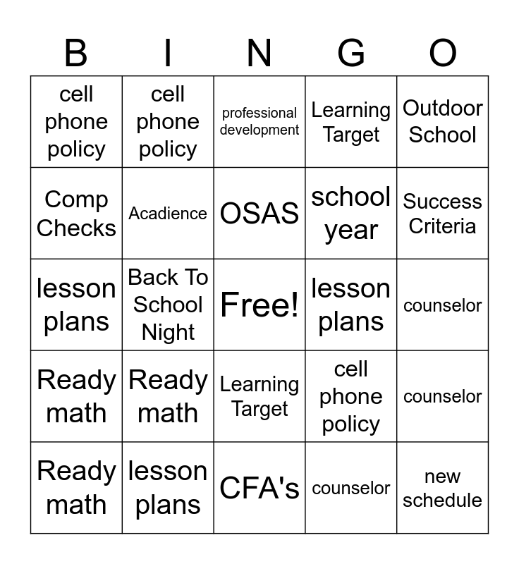 ⚠ This card has duplicate items: OSAS (3), lesson plans (3), professional development (3), Ready math (3), counselor (3), Systems Doc (3), Acadience (3), Evidenced based (3), school year (3), Success Criteria (3), Learning Target (3), CFA's (3), Comp Checks (3), desks (3), classroom (3), cell phone policy (3), new schedule (3), Outdoor School (3), Back To School Night (3)