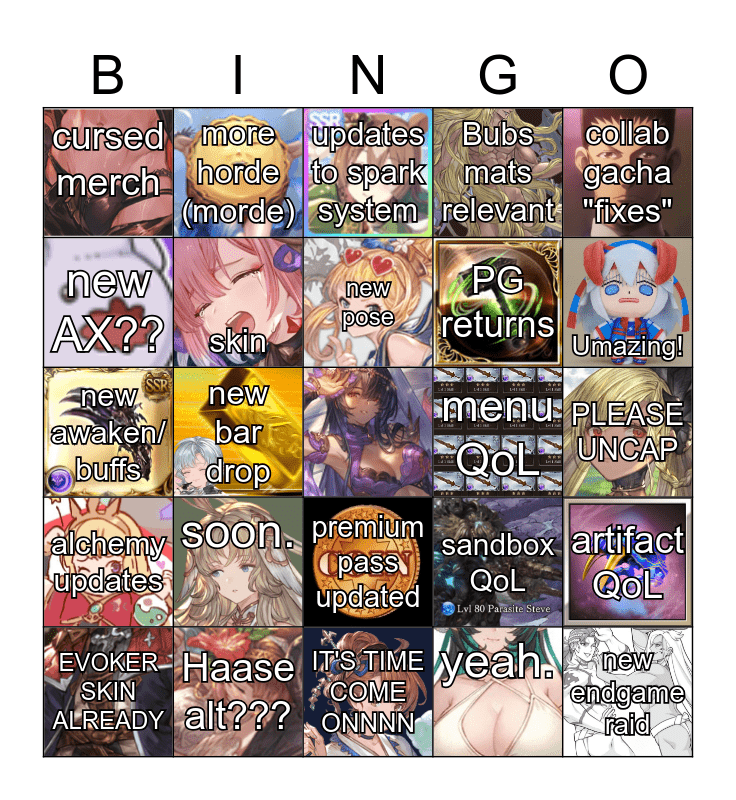 This bingo card has 24 images, a free space and 24 words: soon., Haase alt???, new pose, EVOKER SKIN ALREADY, collab gacha "fixes", cursed merch, new AX??, more horde (morde), menu QoL, premium pass updated, PG returns, new awaken/ buffs, sandbox QoL, artifact QoL, skin, yeah., PLEASE UNCAP, updates to spark system, Umazing!, new bar drop, new endgame raid, alchemy updates, Bubs mats relevant and IT'S TIME COME ONNNN.