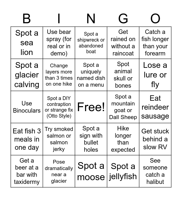 This bingo card has a free space and 24 words: Try smoked salmon or salmon jerky, Pose dramatically near a glacier, Spot a uniquely named dish on a menu, Get a beer at a bar with taxidermy, Catch a fish longer than your forearm, Spot a sea lion, Spot a glacier calving, Use bear spray (for real or in demo), Spot a mountain goat or Dall Sheep, Spot a sign with bullet holes, Spot animal skull or bones, Use Binoculars, Hike longer than expected, Get stuck behind a slow RV, Change layers more than 3 times on one hike, Spot a jellyfish, Eat reindeer sausage, Spot a shipwreck or abandoned boat, Lose a lure or fly, Spot a DIY contraption or strange fix (Otto Style), See someone catch a halibut, Eat fish 3 meals in one day, Get rained on without a raincoat and Spot a moose.
