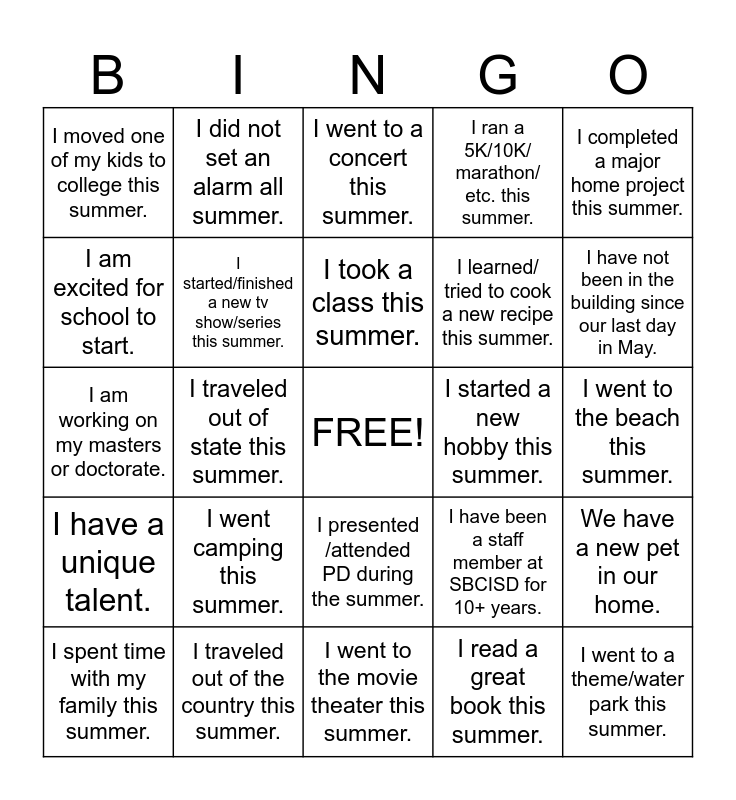 This bingo card has a free space and 24 words: I went camping this summer., I traveled out of the country this summer., I took a class this summer., I spent time with my family this summer., I completed a major home project this summer., I moved one of my kids to college this summer., I am excited for school to start., I did not set an alarm all summer., I started a new hobby this summer., I presented /attended PD during the summer., I learned/ tried to cook a new recipe this summer., I am working on my masters or doctorate., I have been a staff member at SBCISD for 10+ years., We have a new pet in our home., I started/finished a new tv show/series this summer., I read a great book this summer., I went to the beach this summer., I went to a concert this summer., I have not been in the building since our last day in May., I traveled out of state this summer., I went to a theme/water park this summer., I have a unique talent., I ran a 5K/10K/ marathon/ etc. this summer. and I went to the movie theater this summer..