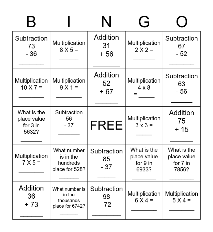 This bingo card has a free space and 24 words: What number is in the hundreds place for 528? _______, What number is in the thousands place for 6742? _______, Addition 52 + 67 ______, Addition 36 + 73 ______, Subtraction 67 - 52 _______, Subtraction 73 - 36 _______, Multiplication 10 X 7 = ________, Multiplication 8 X 5 = ______, Multiplication 3 x 3 = _____, Subtraction 85 - 37 _____, Multiplication 4 x 8 = _____, What is the place value for 3 in 5632? _______, What is the place value for 9 in 6933? ________, What is the place value for 7 in 7856? ________, Multiplication 9 X 1 = ________, Multiplication 6 X 4 = ________, Addition 75 + 15 ______, Addition 31 + 56 _______, Subtraction 63 - 56 ______, Subtraction 56 - 37 _______, Multiplication 5 X 4 = ________, Multiplication 7 X 5 = ________, Multiplication 2 X 2 = _______ and Subtraction 98 -72 ________.
