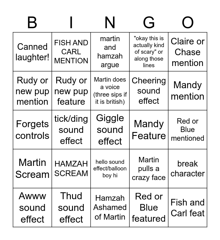 This bingo card has 25 words: HAMZAH SCREAM, Hamzah Ashamed of Martin, Martin does a voice (three sips if it is british), Awww sound effect, Claire or Chase mention, Canned laughter!, Rudy or new pup mention, FISH AND CARL MENTION, Mandy Feature, hello sound effect/balloon boy hi, Cheering sound effect, Forgets controls, Martin pulls a crazy face, break character, Rudy or new pup feature, Fish and Carl feat, Red or Blue mentioned, martin and hamzah argue, Mandy mention, tick/ding sound effect, Giggle sound effect, Thud sound effect, Martin Scream, "okay this is actually kind of scary" or along those lines and Red or Blue featured.
