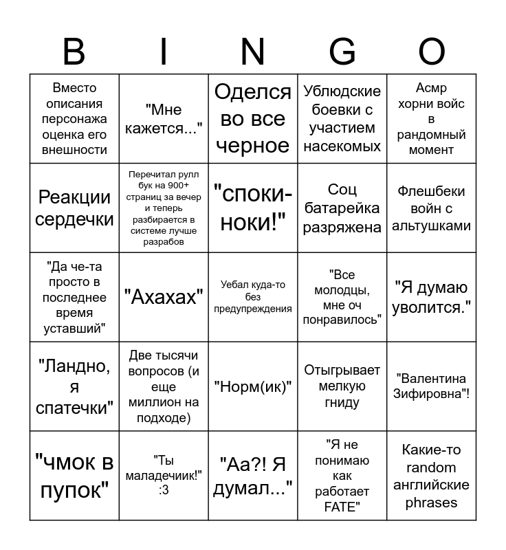 This bingo card has a free space and 24 words: Две тысячи вопросов (и еще миллион на подходе), "Ты маладечиик!" :3, "споки- ноки!", "чмок в пупок", Асмр хорни войс в рандомный момент, Вместо описания персонажа оценка его внешности, Реакции сердечки, "Мне кажется...", "Все молодцы, мне оч понравилось", "Норм(ик)", Соц батарейка разряжена, "Да че-та просто в последнее время уставший", Отыгрывает мелкую гниду, "Валентина Зифировна"!, Перечитал рулл бук на 900+ страниц за вечер и теперь разбирается в системе лучше разрабов, "Я не понимаю как работает FATE", "Я думаю уволится.", Оделся во все черное, Флешбеки войн с альтушками, "Ахахах", Какие-то random английские phrases, "Ландно, я спатечки", Ублюдские боевки с участием насекомых and "Аа?! Я думал...".