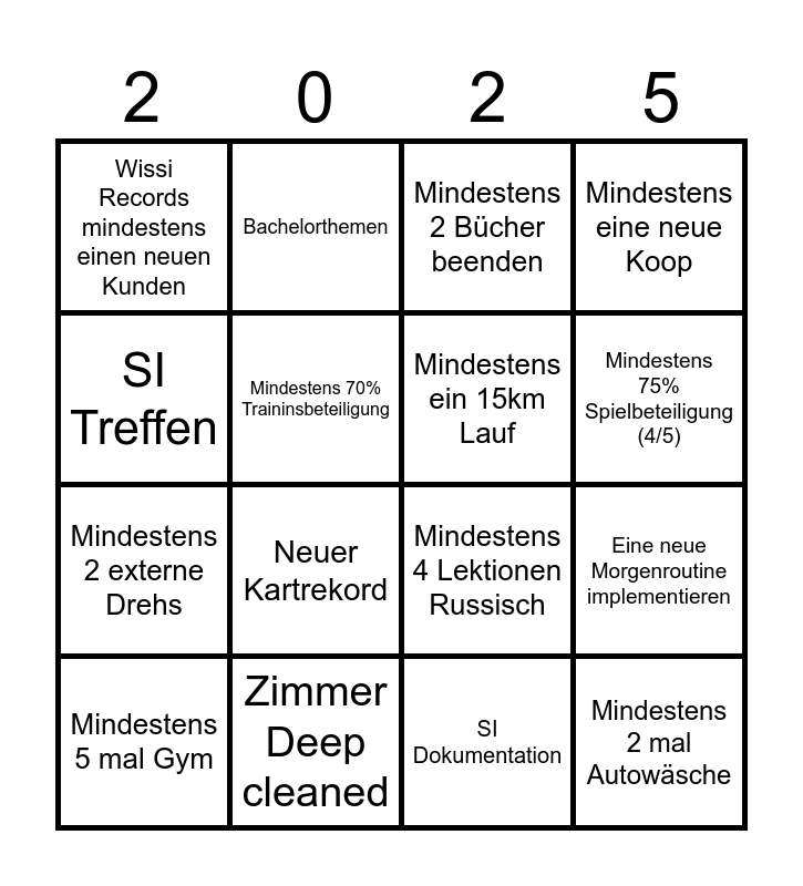 This bingo card has 16 words: Zimmer Deep cleaned, Eine neue Morgenroutine implementieren, Mindestens 2 Bücher beenden, Wissi Records mindestens einen neuen Kunden, Mindestens 2 externe Drehs, Bachelorthemen, Mindestens 4 Lektionen Russisch, SI Dokumentation, SI Treffen, Mindestens 70% Traininsbeteiligung, Mindestens 5 mal Gym, Mindestens eine neue Koop, Neuer Kartrekord, Mindestens 75% Spielbeteiligung (4/5), Mindestens ein 15km Lauf and Mindestens 2 mal Autowäsche.