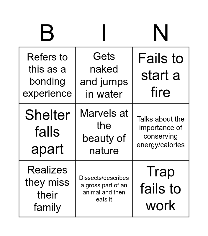This bingo card has a free space and 8 words: Talks about the importance of conserving energy/calories, Fails to start a fire, Gets naked and jumps in water, Realizes they miss their family, Refers to this as a bonding experience, Trap fails to work, Shelter falls apart and Dissects/describes a gross part of an animal and then eats it.
