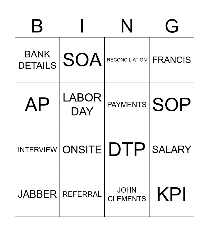 This bingo card has 101 words: Free!, BSMH, AP, DEBIT MEMO, CREDIT MEMO, ACCRUALS, IP, 3-WAY MATCHING, MASTER DATA, CAREER GOALS, MINISTRY, RCA, DEBIT BALANCE, NORMAL ENTRY, PROCESS IMPROVEMENT, SLA, KPI, DUPLICATE PAYMENT, W9, BANK ACCOUNT SETUP, WORKDAY, HEALTHCARE, NIGHT SHIFT, HYBRID, BGC, ONSITE, FRANCIS, BRENT, WORK SHADOW, TRANSITION, SOA, RECONCILIATION, NON-PO, PO, T&E, PAYMENT TERMS, DISAGREEMENT, INTERNET CONNECTION, PAYMENT RUN, START UP, UNIONBANK, PEME, NBI, LAPTOP, HEADSET, JABBER, HOSPITAL, CLINIC, IRELAND, OHIO, THANKSGIVING, LABOR DAY, BACK PAY, SAM, VANGIE, INVOICE, COORDINATOR, IVM, SUPPLIER MAINTENANCE, CS/CA, PAYMENTS, BRAINWARE, ONBASE, EY, EXPERIENCE, INTERVIEW, CAREER GROWTH, SALARY, LATE PAYMENTS, PAID ON TIME, FRAUD, SHARED SERVICE, BANK DETAILS, TIN/FEIN, SOP, DTP, MIGRATION, AUTOMATION, ESCALATION, JOB OFFER, WAVE 1, WAVE 2, REFERRAL, ANALYST, EXPERT, ASIA SELECT, JOHN CLEMENTS, VIVENTIS, MICHAEL PAGE, EXCEL, CLEAN UP, CHATGPT, AI, CAMERA, NORDIC, SHOWER AREA, COFFEE, HR, BIGGER PERSON, MASSAGE CHAIR and CONCESSIONAIRE.