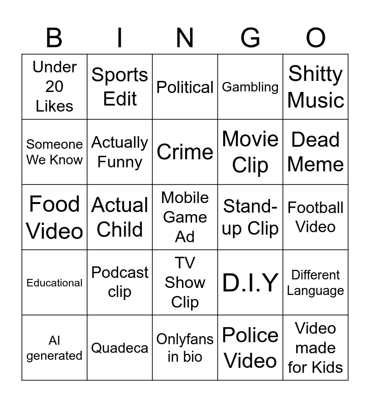 This bingo card has a free space and 24 words: Podcast clip, Quadeca, Crime, AI generated, Shitty Music, Under 20 Likes, Someone We Know, Sports Edit, Stand-up Clip, TV Show Clip, Movie Clip, Food Video, D.I.Y, Different Language, Actually Funny, Police Video, Football Video, Political, Dead Meme, Actual Child, Video made for Kids, Educational, Gambling and Onlyfans in bio.