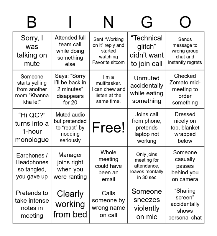 This bingo card has a free space and 24 words: Manager joins right when you were ranting, Clearly working from bed, I’m a multitasker. I can chew and listen at the same time., Pretends to take intense notes in meeting, Sends message to wrong group chat and instantly regrets, Sorry, I was talking on mute, Someone starts yelling from another room "Khanna kha le!", Attended full team call while doing something else, Joins call from phone, pretends laptop not working, Whole meeting could have been an email, Unmuted accidentally while eating something, “Hi QC?” turns into a 1-hour monologue, Only joins meeting for attendance, leaves mentally in 30 sec, Someone casually passes behind you on camera, Says: “Sorry I’ll be back in 2 minutes” disappears for 20, Someone sneezes violently on mic, Dressed nicely on top, blanket wrapped below, Sent “Working on it” reply and started watching Favorite sitcom, Checked Zomato mid-meeting to order something, Muted audio but pretended to “react” by nodding seriously, “Sharing screen" accidentally shows personal chat, Earphones / Headphones so tangled, you gave up, “Technical glitch” didn’t want to join call and Calls someone by wrong name on call.