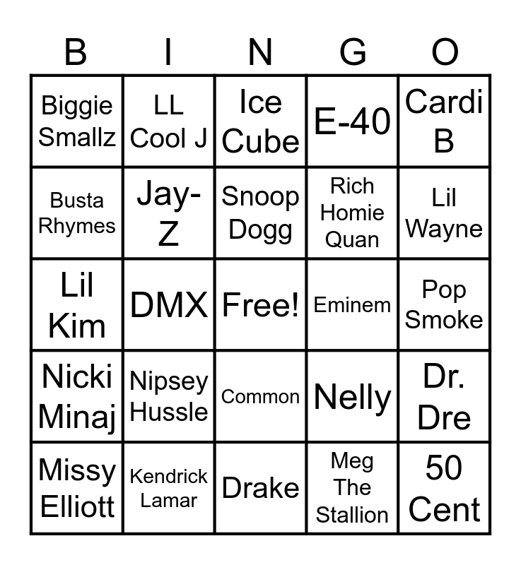 This bingo card has a free space and 29 words: Clipse, Kendrick Lamar, Ice Cube, Tupac, Cardi B, Biggie Smallz, Jay-Z, Snoop Dogg, Eminem, Dr. Dre, Missy Elliott, DMX, Meg The Stallion, 50 Cent, Lil Kim, OutKast, Drake, Nelly, Lil Wayne, Nicki Minaj, Nipsey Hussle, Bow Wow, Rich Homie Quan, Pop Smoke, Busta Rhymes, LL Cool J, Common, E-40 and Juvenile.