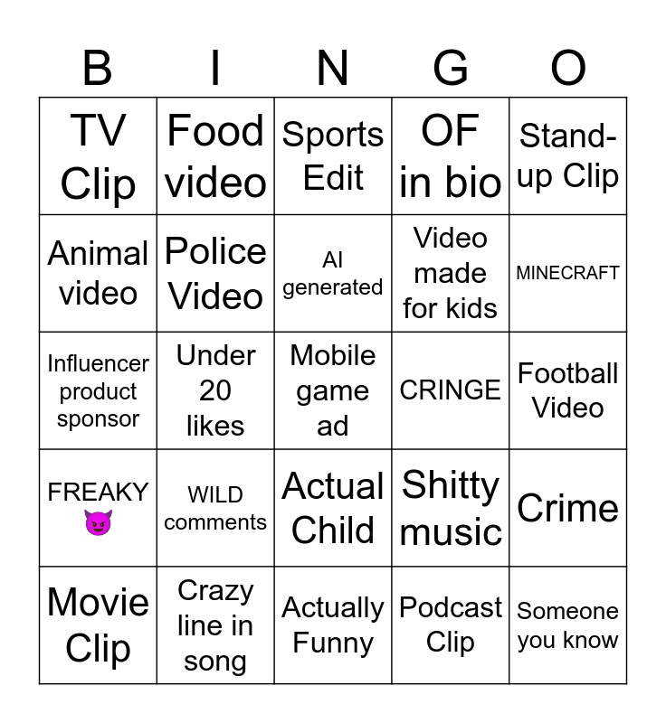 This bingo card has a free space and 24 words: WILD comments, Crazy line in song, AI generated, Movie Clip, Stand-up Clip, TV Clip, Animal video, Food video, CRINGE, Actual Child, Video made for kids, Influencer product sponsor, Shitty music, Crime, Police Video, Podcast Clip, Football Video, Sports Edit, MINECRAFT, Under 20 likes, Someone you know, FREAKY 😈, OF in bio and Actually Funny.