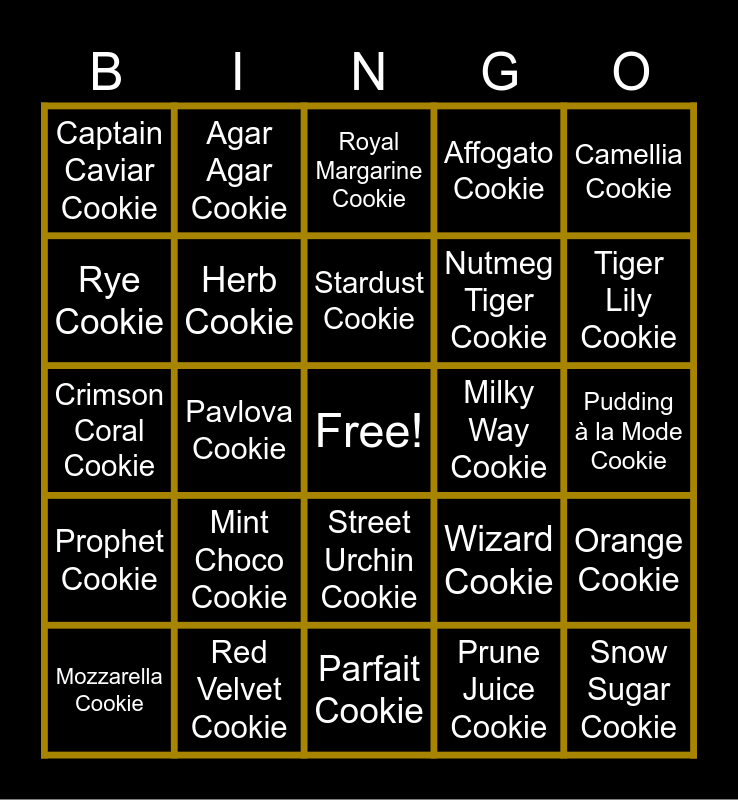 This bingo card has a free space and 148 words: GingerBrave, Strawberry Cookie, Ninja Cookie, Angel Cookie, Muscle Cookie, Wizard Cookie, Beet Cookie, Devil Cookie, Custard Cookie III, Clover Cookie, Carrot Cookie, Avocado Cookie, Pancake Cookie, Onion Cookie, Gumball Cookie, Blackberry Cookie, Adventurer Cookie, Alchemist Cookie, Cherry Cookie, Knight Cookie, Princess Cookie, Orange Cookie, Lemon Cookie, Cream Soda Cookie, Sugarfly Cookie, Pavlova Cookie, Agar Agar Cookie, Wedding Cake Cookie, Black Forest Cookie, Black Sapphire Cookie, Candy Apple Cookie, Okchun Cookie, Green Tea Mousse, Pudding à la Mode Cookie, Choco Drizzle Cookie, Red Osmanthus Cookie, Golden Osmanthus Cookie, Smoked Cheese Cookie, Nutmeg Tiger Cookie, Star Coral Cookie, Peach Blossom Cookie, Cloud Haetae Cookie, Street Urchin Cookie, Caramel Choux Cookie, Butter Roll Cookie, Matcha Cookie, Mercurial Knight Cookie, Silverbell Cookie, Rebel Cookie, Crème Brûlée Cookie, Linzer Cookie, Olive Cookie, Mozzarella Cookie, Fettuccine Cookie, Burnt Cheese Cookie, Frilled Jellyfish Cookie, Peppermint Cookie, Black Lemonade Cookie, Rockstar Cookie, Tarte Tatin Cookie, Royal Margarine Cookie, Kouign-Amann Cookie, Prune Juice Cookie, Space Doughnut, Blueberry Pie Cookie, Milky Way Cookie, Prophet Cookie, Pinecone Cookie, Carol Cookie, Macaron Cookie, Schwarzwälder, Candy Diver Cookie, Captain Caviar Cookie, Cream Unicorn Cookie, Financier Cookie, Crunchy Chip Cookie, Wildberry Cookie, Cherry Blossom Cookie, Caramel Arrow Cookie, Affogato Cookie, Tea Knight Cookie, Eclair Cookie, Cocoa Cookie, Cotton Cookie, Pumpkin Pie Cookie, Twizzly Gummy Cookie, Mala Sauce Cookie, Moon Rabbit Cookie, Raspberry Cookie, Parfait Cookie, Sorbet Shark Cookie, Squid Ink Cookie, Lilac Cookie, Mango Cookie, Red Velvet Cookie, Pastry Cookie, Fig Cookie, Strawberry Crepe Cookie, Black Raisin Cookie, Almond Cookie, Latte Cookie, Kumiho Cookie, Rye Cookie, Espresso Cookie, Madeleine Cookie, Licorice Cookie, Poison Mushroom Cookie, Milk Cookie, Purple Yam Cookie, Pomegranate Cookie, Chili Pepper Cookie, Sparkling Cookie, Dark Choco Cookie, Herb Cookie, Mint Choco Cookie, Werewolf Cookie, Tiger Lily Cookie, Vampire Cookie, Snow Sugar Cookie, Camellia Cookie, Elder Faerie Cookie, Crimson Coral Cookie, Shining Glitter Cookie, Capsaicin Cookie, Stardust Cookie, Sherbet Cookie, Oyster Cookie, Clotted Cream Cookie, Pitaya Dragon Cookie, Fire Spirit Cookie, Wind Archer Cookie, Stormbringer Cookie, Moonlight Cookie, Black Pearl Cookie, Frost Queen Cookie, Sea Fairy Cookie, Pure Vanilla Cookie, Hollyberry Cookie, Dark Cacao Cookie, Golden Cheese Cookie, White Lily Cookie, Mystic Flour Cookie, Burning Spice Cookie, Shadow Milk Cookie, Eternal Sugar Cookie, Lime Cookie, Jagae Cookie and Manju Cookie.