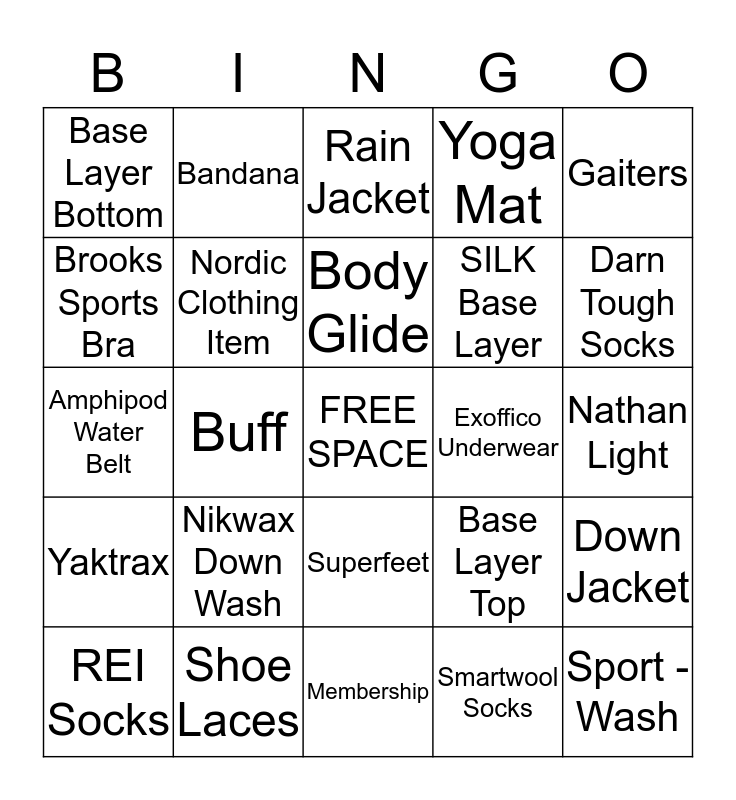 This bingo card has a free space and 24 words: Nikwax Down Wash, Shoe Laces, Body Glide, REI Socks, Gaiters, Base Layer Bottom, Brooks Sports Bra, Bandana, Exoffico Underwear, Superfeet, SILK Base Layer, Amphipod Water Belt, Base Layer Top, Down Jacket, Nordic Clothing Item, Smartwool Socks, Nathan Light, Rain Jacket, Darn Tough Socks, Buff, Sport - Wash, Yaktrax, Yoga Mat and Membership.