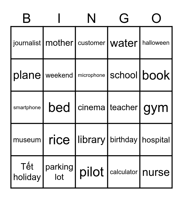 This bingo card has 1 images, a free space and 24 words: rice, parking lot, microphone, Tết holiday, halloween, journalist, plane, mother, teacher, library, school, smartphone, birthday, hospital, weekend, calculator, gym, customer, book, bed, nurse, museum, water and pilot.