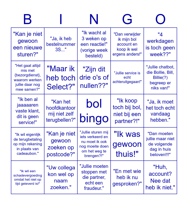 This bingo card has a free space and 24 words: "Kan je niet gewoon zoeken op postcode?", "Uw collega kon wel op naam zoeken.", "Zijn dit drie o's of nullen??", "Ik wil een schadevergoeding omdat het niet op tijd geleverd is!", "4 werkdagen is toch geen week??", "Kan je niet gewoon een nieuwe sturen?", "Het gaat altijd mis met {bezorgdienst}, waarom werken jullie daar nog mee samen?", "Ja, ik heb bestelnummer 3S...", "Ik koop toch bij bol, niet bij een partner?!", "Jullie sturen mij iets verkeerd en nu moet ik ook nog moeite doen om het weg te brengen?!", "Jullie service is echt achteruitgegaan!", "Ik ben al jaaaaaren vaste klant, dit is geen service!", "Ik was gewoon thuis!", "Dan moeten jullie maar niet de volgende dag in huis beloven!!!", "Maar ik heb toch Select?", "En met wie heb ik nu gesproken?", "Ja, ik moet het toch echt vandaag hebben.", "Ik wacht al 3 weken op een reactie!" (vorige week besteld), "Jullie chatbot, die Bollie, Bill, Billie(?) begreep er niks van!", "Kan het hoofdkantoor mij niet zelf terugbellen?", "Huh, account? Nee dat heb ik niet.", "Ik wil eigenlijk de terugbetaling op mijn rekening in plaats van cadeaubon.", "Dan verwijder ik mijn bol account en koop ik wel ergens anders!" and "Jullie moeten stoppen met die partner, echt een fraudeur.".
