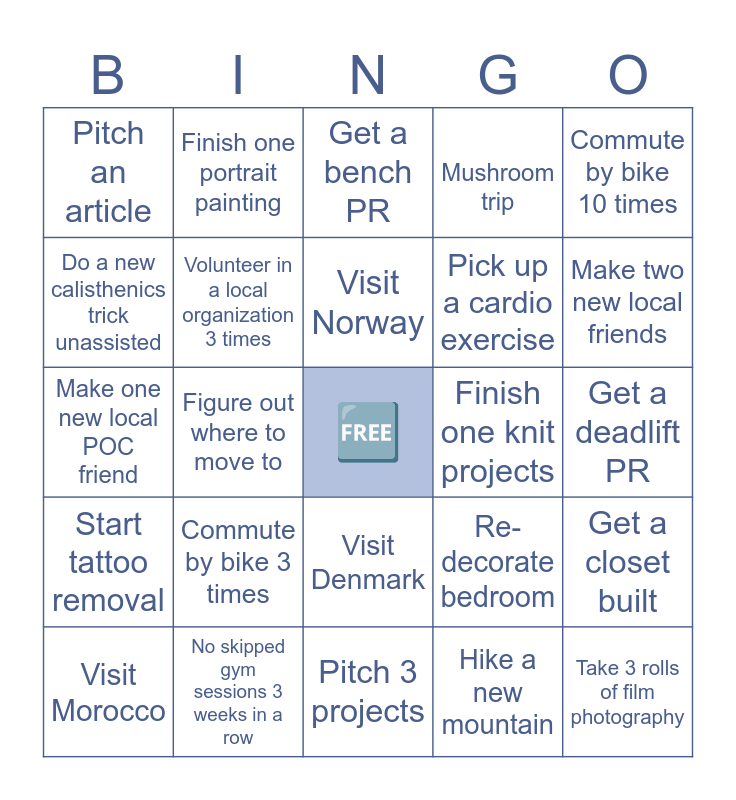 This bingo card has a free space and 24 words: Commute by bike 3 times, No skipped gym sessions 3 weeks in a row, Visit Norway, Visit Morocco, Commute by bike 10 times, Pitch an article, Do a new calisthenics trick unassisted, Finish one portrait painting, Finish one knit projects, Visit Denmark, Pick up a cardio exercise, Make one new local POC friend, Re-decorate bedroom, Get a closet built, Volunteer in a local organization 3 times, Hike a new mountain, Get a deadlift PR, Get a bench PR, Make two new local friends, Figure out where to move to, Take 3 rolls of film photography, Start tattoo removal, Mushroom trip and Pitch 3 projects.