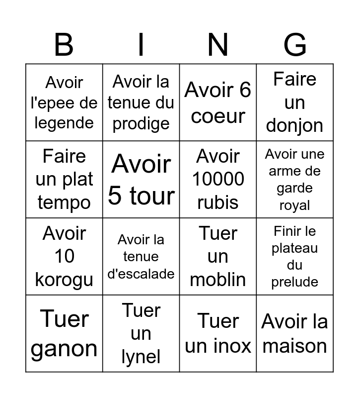 This bingo card has 16 words: Tuer un lynel, Finir le plateau du prelude, Avoir 6 coeur, Avoir l'epee de legende, Avoir 10 korogu, Avoir la tenue du prodige, Tuer un moblin, Tuer un inox, Faire un plat tempo, Avoir 5 tour, Tuer ganon, Faire un donjon, Avoir la tenue d'escalade, Avoir une arme de garde royal, Avoir 10000 rubis and Avoir la maison.