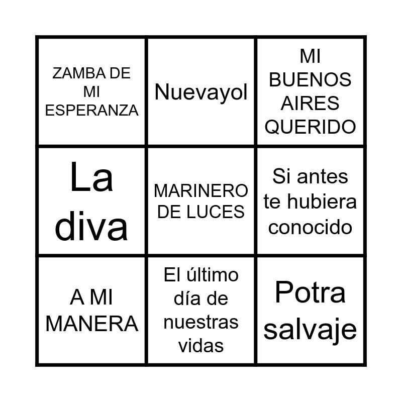 This bingo card has 29 words: LUNA TUCUMANA, GARGANTA CON ARENA, ROSA, ROSA, A DON ATA, ZAMBA DE MI ESPERANZA, MI BUENOS AIRES QUERIDO, A MI MANERA, TE QUIERO TANTO, PEGA LA VUELTA, AMOR SALVAJE, QUE NADIE SEPA MI SUFRIR, LA POLLERA AMARILLA, BOMBÓN ASESINO, ZAMBA PARA OLVIDARTE, ETERNO AMOR, VIVIR ASÍ ES MORIR DE AMOR, DESPEINADA, CARNAVAL, MARINERO DE LUCES, DAME FUEGO, A quién le importa, A mi manera, Potra salvaje, Si antes te hubiera conocido, La diva, Nuevayol, La pelirroja, El último día de nuestras vidas and Disco Rayado.