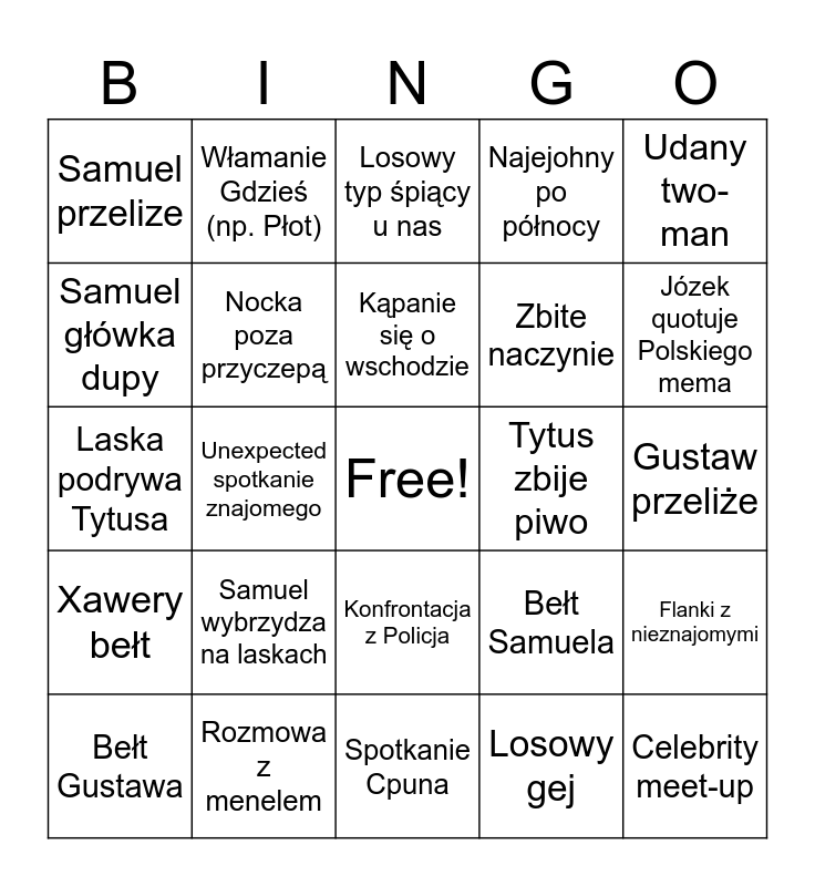 This bingo card has a free space and 24 words: Bełt Gustawa, Samuel wybrzydza na laskach, Kąpanie się o wschodzie, Losowy gej, Udany two-man, Samuel przelize, Włamanie Gdzieś (np. Płot), Losowy typ śpiący u nas, Tytus zbije piwo, Gustaw przeliże, Laska podrywa Tytusa, Nocka poza przyczepą, Bełt Samuela, Flanki z nieznajomymi, Samuel główka dupy, Rozmowa z menelem, Spotkanie Cpuna, Najejohny po północy, Józek quotuje Polskiego mema, Xawery bełt, Unexpected spotkanie znajomego, Konfrontacja z Policja, Zbite naczynie and Celebrity meet-up.