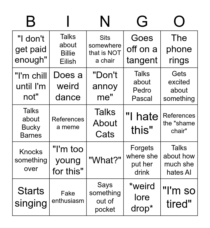 This bingo card has a free space and 36 words: Gets interrupted by someone coming in late, Says her age, Forgets what she's talking about, Does a weird dance, Forgets where she put her drink, Knocks something over, "Don't annoy me", "Huh?", The phone rings, Makes a disgusted face, References a meme, Goes off on a tangent, Tries to be relatable, "I hate this", Gets excited about something, "I don't get paid enough", "I'm too old for this", "I'm too young for this", "I'm so tired", Sits somewhere that is NOT a chair, References the "shame chair", Talks about how much she hates AI, Fake enthusiasm, Starts singing, Says something out of pocket, Talks about Billie Eilish, Talks about Bucky Barnes, Talks about K-Pop Demon Hunters, Talks about Pedro Pascal, "I'm chill until I'm not", "Don't go in my office/behind my desk...", *blank stare*, *weird lore drop*, "What?", "Don't make me want to quit" and "I do have TikTok".