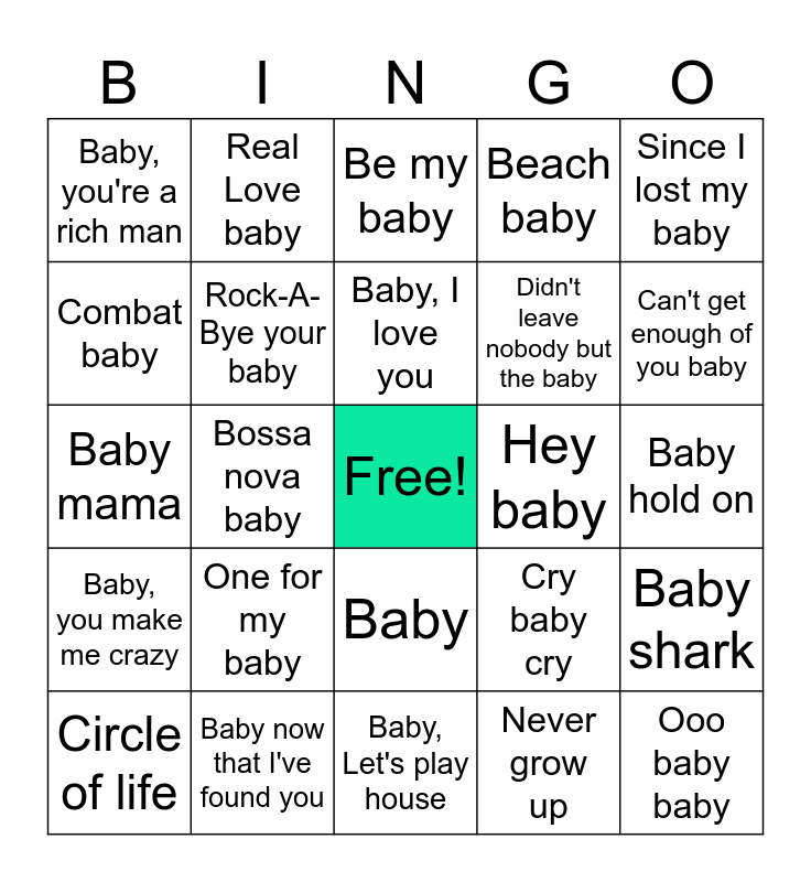 This bingo card has a free space and 91 words: ABC, Always be my baby, Baby, B-A-B-Y, Baby,Baby, Baby, Baby, Baby, Baby be mine, Baby boy, Baby come back, Baby come back to me, baby don't lie, Baby drive, Baby got back, Baby hold on, Baby I, Baby, I love you, Baby, I love your way, Baby I'm a star, Baby I'm yours, Baby I need your loving, Baby it's you, Baby I won't, Baby, Let's play house, Baby love, Baby mama, Baby now that I've found you, ...Baby one more time, Baby one more time, baby, please don't go, Baby powder, Baby says, Baby shark, Baby, what a big surprise, Baby, you make me crazy, Baby, you're a rich man, Beach baby, Be my baby, Be my baby tonight, Bossa nova baby, Can't get enough of you baby, Circle of life, Combat baby, Come on over, Comin' home baby, Cry baby, Cry baby cry, Dance, baby!, Darling Baby, Daughter, Daughters, Dayum, baby, Didn't leave nobody but the baby, Don't worry baby, Girls that dance, Give it to me baby, Here comes my baby, Hey baby, Ice ice baby, ily, I'm your baby tonight, Industry baby, Magic dance, Million dollar baby, Missing my baby, My baby, My baby just cares for me, My girl, Never grow up, No more, Offf baby, One for my baby, Ooo baby baby, Pretty baby, Pretty little baby, Real Love baby, Rock-A-Bye your baby, Rock me baby, Rock wit u, Runaway baby, Run baby run, Scorsese baby daddy, Since I lost my baby, Somebody's baby, Someone else calling you baby, Steppin' out with my baby, Take good care of my baby, There goes my baby, Too busy thinking about my baby, You'll be in my heart, (you're) having my baby and You're just a baby.