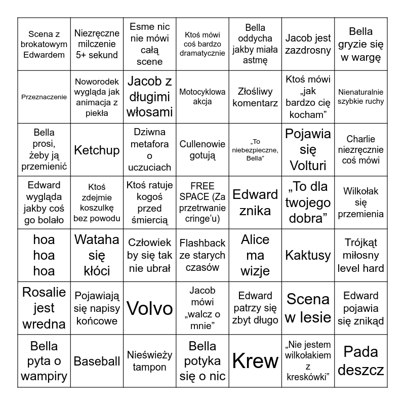 This bingo card has a free space and 48 words: Edward patrzy się zbyt długo, Ktoś mówi „jak bardzo cię kocham”, Bella potyka się o nic, Ktoś zdejmie koszulkę bez powodu, Dziwna metafora o uczuciach, Wilkołak się przemienia, Niezręczne milczenie 5+ sekund, Baseball, Jacob jest zazdrosny, Flashback ze starych czasów, Bella gryzie się w wargę, Ktoś mówi coś bardzo dramatycznie, Pojawia się Volturi, „To niebezpieczne, Bella”, Rosalie jest wredna, „To dla twojego dobra”, Przeznaczenie, Nienaturalnie szybkie ruchy, Scena w lesie, Bella oddycha jakby miała astmę, Złośliwy komentarz, Ktoś ratuje kogoś przed śmiercią, Scena z brokatowym Edwardem, Noworodek wygląda jak animacja z piekła, Edward pojawia się znikąd, Jacob z długimi włosami, Charlie niezręcznie coś mówi, Bella pyta o wampiry, Cullenowie gotują, Ketchup, „Nie jestem wilkołakiem z kreskówki”, Edward znika, Trójkąt miłosny level hard, Pojawiają się napisy końcowe, Edward wygląda jakby coś go bolało, Alice ma wizje, Kaktusy, Bella prosi, żeby ją przemienić, Człowiek by się tak nie ubrał, Volvo, hoa hoa hoa, Pada deszcz, Esme nic nie mówi całą scene, Nieświeży tampon, Motocyklowa akcja, Jacob mówi „walcz o mnie”, Wataha się kłóci and Krew.