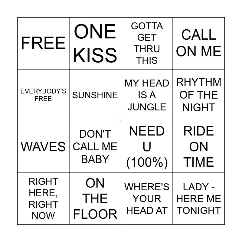 This bingo card has 30 words: CHILDREN, PUSH THE FEELING ON, RIDE ON TIME, WE FOUND LOVE, FREE, GOTTA GET THRU THIS, MY HEAD IS A JUNGLE, FINALLY, ON THE FLOOR, THE WEEKEND, WHERE'S YOUR HEAD AT, RIGHT HERE, RIGHT NOW, I'M GONNA GET YOU, GOOD LIFE, DON'T CALL ME BABY, MOVING TOO FAST, SANDSTORM, LADY - HERE ME TONIGHT, SING IT BACK, EVERYBODY'S FREE, NEED U (100%), HOW DEEP IS YOUR LOVE, ONE KISS, WAVES, SUNSHINE, CALL ON ME, MOVING ON UP, RHYTHM IS A DANCER, RHYTHM OF THE NIGHT and BETTER OFF ALONE.