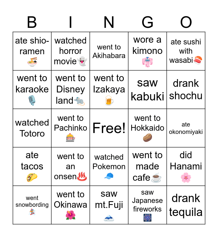 This bingo card has a free space and 24 words: went to an onsen♨️, went to Okinawa🌺, went to Izakaya🍺, went snowbording 🏂, ate sushi with wasabi🍣, ate shio-ramen🍜, went to karaoke🎙️, watched horror movie👻, went to Hokkaido 🥔, watched Pokemon🧢, saw kabuki, watched Totoro, went to made cafe☕️, did Hanami🌸, went to Disney land🐀, saw Japanese fireworks🎆, ate okonomiyaki, went to Akihabara, drank shochu, went to Pachinko🎰, drank tequila, ate tacos🌮, wore a kimono👘 and saw mt.Fuji🗻.