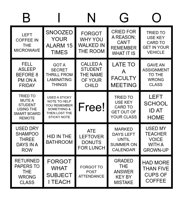 This bingo card has a free space and 54 words: ARRIVED AT SCHOOL WITH YOUR CLOTHES INSIDE OUT, USED DRY SHAMPOO THREE DAYS IN A ROW, WORE TWO DIFFERENT SHOES TO SCHOOL, BROUGHT YOUR DIAPER BAG INSTEAD OF YOUR SCHOOL BAG, ATE LEFTOVER DONUTS FOR LUNCH, TOOK CASUAL FRIDAY TO A WHOLE NEW LEVEL, CRIED FOR A REASON; CAN’T REMEMBER WHAT IT IS, TOLD YOUR STUDENTS TO HAVE A GOOD WEEKEND ON A TUESDAY AFTERNOON, FELL ASLEEP BEFORE 8 PM ON A FRIDAY, TOLD YOUR STUDENTS TO HAVE A GOOD EVENING WHEN THEY LEFT FOR LUNCH, LEFT COFFEE IN THE MICROWAVE, CALLED A STUDENT BY THE WRONG NAME, FORGOT WHAT SUBJECT I TEACH, RETURNED PAPERS TO THE WRONG CLASS, COULDN’T FIND CAR IN THE PARKING LOT, FORGOT TO POST ATTENDANCE, HAD MORE THAN FIVE CUPS OF COFFEE, LATE TO A FACULTY MEETING, FORGOT WHAT DAY IT IS, LEFT SCHOOL ID AT HOME, MARKED DAYS LEFT UNTIL SUMMER ON CALENDAR, FORGOT WHAT YEAR IT IS, TRIED TO USE KEY CARD TO GET OUT OF YOUR CLASS, TRIED TO USE KEY CARD TO GET IN YOUR VEHICLE, TOOK A NAP DURING A VIDEO THE STUDENTS WERE WATCHING, SNOOZED YOUR ALARM 15 TIMES, FORGOT TO DO LESSON PLANS, USED THE WRONG ANSWER KEY TO GRADE A TEST, LAUGHED OUT LOUD AT A STUDENT’S ANSWER, GRADED THE ANSWER KEY BY MISTAKE, GOT DRESSED FOR SCHOOL ON THE WEEKEND, WOKE UP THINKING IT WAS THE WEEKEND ON A WEDNESDAY, GAVE A LAST MINUTE CATCH UP DAY, FORGOT TO LEAVE SUB NOTES, FORGOT WHY YOU WALKED IN THE ROOM, YELLED AT A KID FOR HAVING A VAPE WHEN IT WAS REALLY STEAM FROM THEIR NOODLES, TRIED TO MUTE A STUDENT USING THE SMART BOARD REMOTE, USED MY TEACHER VOICE WITH A GROWN-UP, ATE LUNCH IN 3 MINUTES FLAT, GOT A SECRET THRILL FROM LAMINATING THINGS, TOLD YOUR STUDENTS TO PLAY THE QUIET GAME, LOCKED YOURSELF OUT OF THE CLASSROOM, CAUSED A JAM IN THE WORKROOM COPIER, LOST A STUDENT’S TEST WHILE HOLDING IT, HID IN THE BATHROOM, ATE CHOCOLATE FOR BREAKFAST, CHANGED YOUR SEATING CHART 17 TIMES IN ONE MONTH, COULDN’T READ YOUR OWN HANDWRITING, CALLED A STUDENT THE NAME OF YOUR CHILD, USED A STICKY NOTE TO HELP YOU REMEMBER SOMETHING & THEN LOST THE STICKY NOTE, GAVE AN ASSIGNMENT TO THE WRONG CLASS, HAVE SHARPIES IN EVERY COLOR BUT YOU CAN’T FIND THE BLACK ONE, SHOP FOR SCHOOL SUPPLY SALES ALL YEAR LONG and MADE LAST MINUTE COPIES OF THE WRONG ASSIGNMENT.