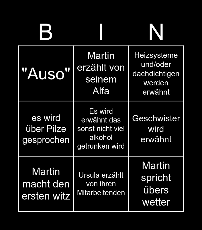 This bingo card has 9 words: Martin macht den ersten witz, Heizsysteme und/oder dachdichtigen werden erwähnt, Martin erzählt von seinem Alfa, es wird über Pilze gesprochen, "Auso", Geschwister wird erwähnt, Es wird erwähnt das sonst nicht viel alkohol getrunken wird, Martin spricht übers wetter and Ursula erzählt von ihren Mitarbeitenden.