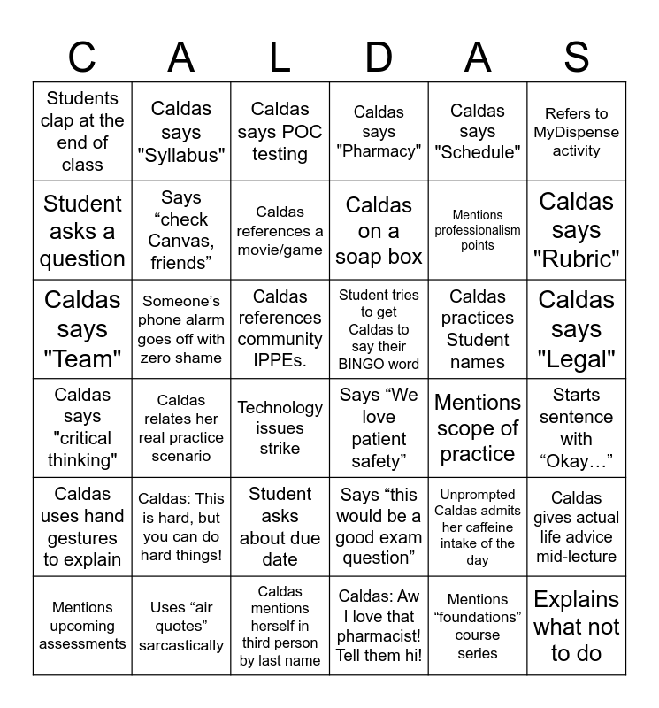 This bingo card has 36 words: Caldas says "critical thinking", Caldas relates her real practice scenario, Caldas mentions herself in third person by last name, Caldas on a soap box, Caldas practices Student names, Caldas says "Legal", Students clap at the end of class, Uses “air quotes” sarcastically, Caldas says POC testing, Says “this would be a good exam question”, Mentions professionalism points, Refers to MyDispense activity, Caldas uses hand gestures to explain, Someone’s phone alarm goes off with zero shame, Caldas references a movie/game, Caldas says "Pharmacy", Unprompted Caldas admits her caffeine intake of the day, Starts sentence with “Okay…”, Student asks a question, Says “check Canvas, friends”, Technology issues strike, Says “We love patient safety”, Mentions scope of practice, Caldas gives actual life advice mid-lecture, Caldas says "Team", Caldas says "Syllabus", Caldas references community IPPEs., Caldas: Aw I love that pharmacist! Tell them hi!, Caldas says "Schedule", Caldas says "Rubric", Mentions upcoming assessments, Caldas: This is hard, but you can do hard things!, Student asks about due date, Student tries to get Caldas to say their BINGO word, Mentions “foundations” course series and Explains what not to do.