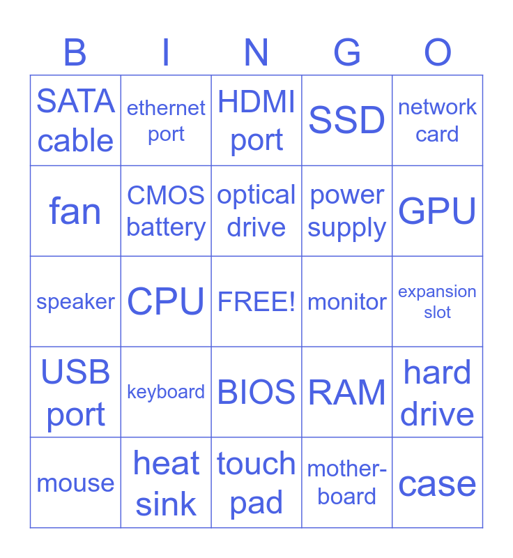 This bingo card has a free space and 24 words: keyboard, heat sink, optical drive, mouse, network card, SATA cable, fan, ethernet port, monitor, BIOS, power supply, speaker, RAM, hard drive, CMOS battery, mother- board, expansion slot, HDMI port, GPU, CPU, case, USB port, SSD and touch pad.