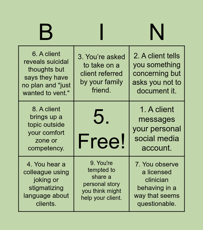 This bingo card has a free space and 8 words: 1. A client messages your personal social media account., 2. A client tells you something concerning but asks you not to document it., 3. You’re asked to take on a client referred by your family friend., 4. You hear a colleague using joking or stigmatizing language about clients., 6. A client reveals suicidal thoughts but says they have no plan and "just wanted to vent.", 7. You observe a licensed clinician behaving in a way that seems questionable., 8. A client brings up a topic outside your comfort zone or competency. and 9. You're tempted to share a personal story you think might help your client..