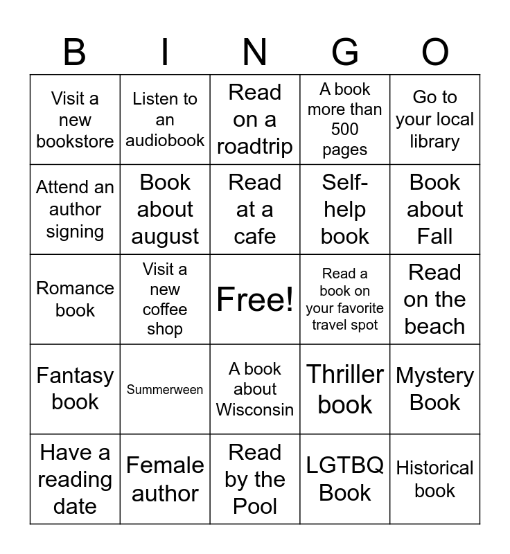 This bingo card has a free space and 24 words: Summerween, Female author, Read at a cafe, Have a reading date, Go to your local library, Visit a new bookstore, Attend an author signing, Listen to an audiobook, Read a book on your favorite travel spot, A book about Wisconsin, Self-help book, Romance book, Thriller book, Mystery Book, Book about august, LGTBQ Book, Read on the beach, Read on a roadtrip, Book about Fall, Visit a new coffee shop, Historical book, Fantasy book, A book more than 500 pages and Read by the Pool.