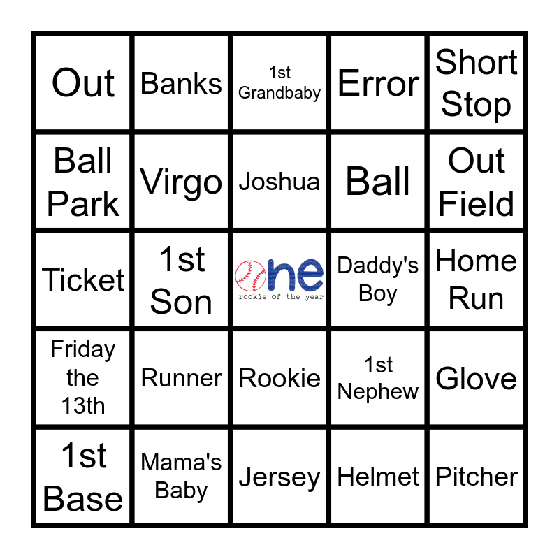 This bingo card has a free space and 42 words: Cleats, Joshua, Catcher, Runner, Helmet, Glove, Pitcher, Strike, 1st Grandbaby, Rookie, Home Run, Out Field, 1st Son, Short Stop, Bat, 1st Nephew, Rylan, Ticket, Grand Slam, Banks, Ball Park, Score Board, Season Tickets, Out, Double Play, Bases Loaded, Ball, September Baby, JRB, Spring Training, All-Star, Friday the 13th, Virgo, Jersey, Safe, 1st Base, Mama's Baby, Daddy's Boy, MVP, Full Count, Error and High 5.