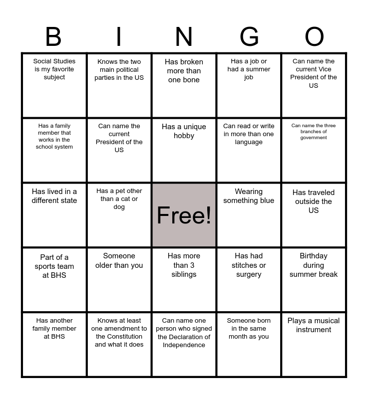 This bingo card has a free space and 24 words: Someone older than you, Knows at least one amendment to the Constitution and what it does, Has a unique hobby, Has another family member at BHS, Can name the current Vice President of the US, Social Studies is my favorite subject, Has a family member that works in the school system, Knows the two main political parties in the US, Wearing something blue, Has more than 3 siblings, Can read or write in more than one language, Has lived in a different state, Has had stitches or surgery, Birthday during summer break, Can name the current President of the US, Someone born in the same month as you, Has traveled outside the US, Has broken more than one bone, Can name the three branches of government, Has a pet other than a cat or dog, Plays a musical instrument, Part of a sports team at BHS, Has a job or had a summer job and Can name one person who signed the Declaration of Independence.