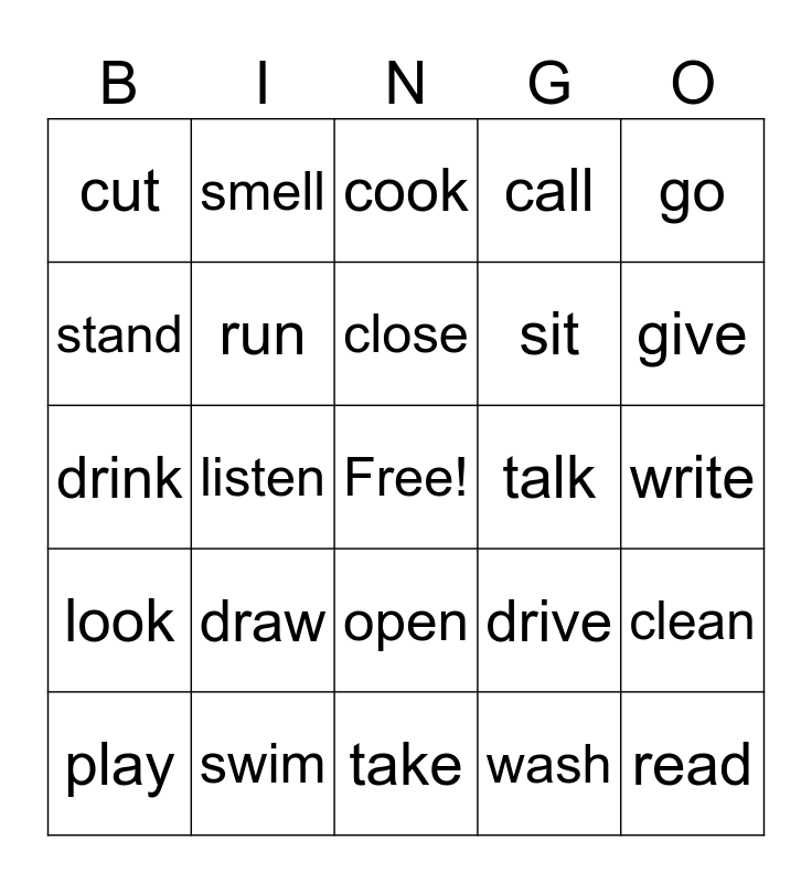 This bingo card has a free space and 40 words: eat, drink, sleep, run, swim, open, close, stop, go, look, listen, call, read, write, talk, draw, laugh, cut, sew, cook, clean, wash, sit, stand, paint, yell, brush, shop, study, fly, help, play, cry, drive, give, take, climb, watch, smell and jump.