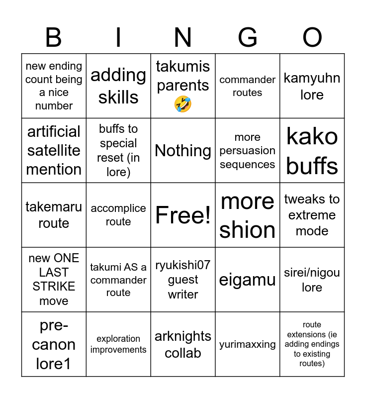 This bingo card has a free space and 24 words: pre-canon lore1, takumi AS a commander route, Nothing, yurimaxxing, kamyuhn lore, new ending count being a nice number, adding skills, takumis parents 🤣, more shion, tweaks to extreme mode, takemaru route, buffs to special reset (in lore), eigamu, sirei/nigou lore, artificial satellite mention, exploration improvements, arknights collab, commander routes, kako buffs, new ONE LAST STRIKE move, accomplice route, ryukishi07 guest writer, more persuasion sequences and route extensions (ie adding endings to existing routes).