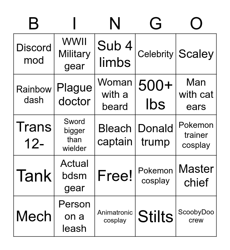 This bingo card has 26 words: Free!, Stilts, Woman with a beard, Person on a leash, Scaley, Discord mod, Rainbow dash, WWII Military gear, Pokemon trainer cosplay, Pokemon cosplay, 500+ lbs, Trans 12-, Master chief, Mech, Sword bigger than wielder, Jesse Spanogle, Celebrity, Tank, Sub 4 limbs, Bleach captain, Man with cat ears, Animatronic cosplay, Donald trump, Actual bdsm gear, Plague doctor and ScoobyDoo crew.