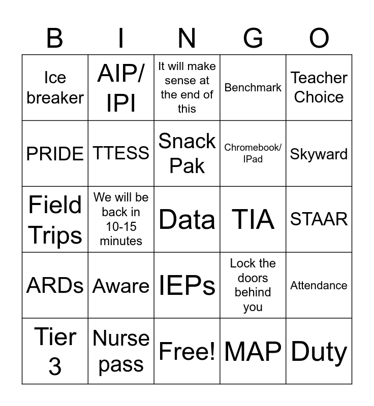 This bingo card has 31 words: Free!, Technology error, We will be back in 10-15 minutes, Does anyone have any questions?, Ice breaker, It will make sense at the end of this, TTESS, Lock the doors behind you, TIA, MAP, STAAR, Data, Duty, Convocation, Skyward, Extended day, Attendance, Aware, ARDs, IEPs, Teacher Choice, Drills, Tier 3, AIP/ IPI, Chromebook/ IPad, PRIDE, Benchmark, Field Trips, Nurse pass, Snack Pak and DEUAs.