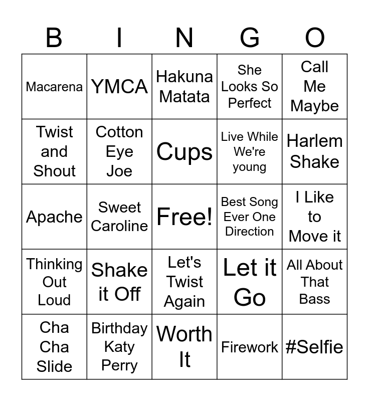 This bingo card has a free space and 77 words: Brave, Getcha Head in the Game, Hakuna Matata, Under the Sea, ABC, Rockin Robin, The Lion Sleeps Tonight, Who Let the Dogs Out, Chicken Dance, Gangnam Style, Happy, Timber, Cups, Twist and Shout, Love Shack, Sweet Caroline, Shout, #Selfie, I Gotta Feeling, Call Me Maybe, Classic, Apache, Cotton Eye Joe, YMCA, She Looks So Perfect, I Love Rock and Roll, Mickey, I Just Can't Wait to Be King, If you're Happy and you Know It, The Wheels on the Bus, Ol Macdonald Had a Farm, Supercalifragilistic, Crazy Frog, Let it Go, Harlem Shake, Live While We're young, What Makes You Beautiful, Three Little Birds, I Like to Move it, Firework, The Fox, Want U Back, Dynamite, Ice Ice Baby, Bust A Move, Get the Party Started, Cha Cha Slide, Macarena, I Whip My Hair, Lip Gloss, Old MacDonald Had a Farm, Let's Twist Again, Everything is Awesome, Don't Stop Believin, Footloose, Sexy and I Know it, Tequila, Life is a Highway, Waka Waka, Uptown Funk, Shake it Off, Ho Hey, Can't Stop the Party, Danza Kuduro, Party in the U.S.A., Fireball Pitbull, Shut Up And Dance, Best Song Ever One Direction, Watch Me Whip Nae Nae, Cheerleader, Uma Thurman, All About That Bass, Thinking Out Loud, Birthday Katy Perry, Honey I'm Good, Worth It and Hokey Pokey.