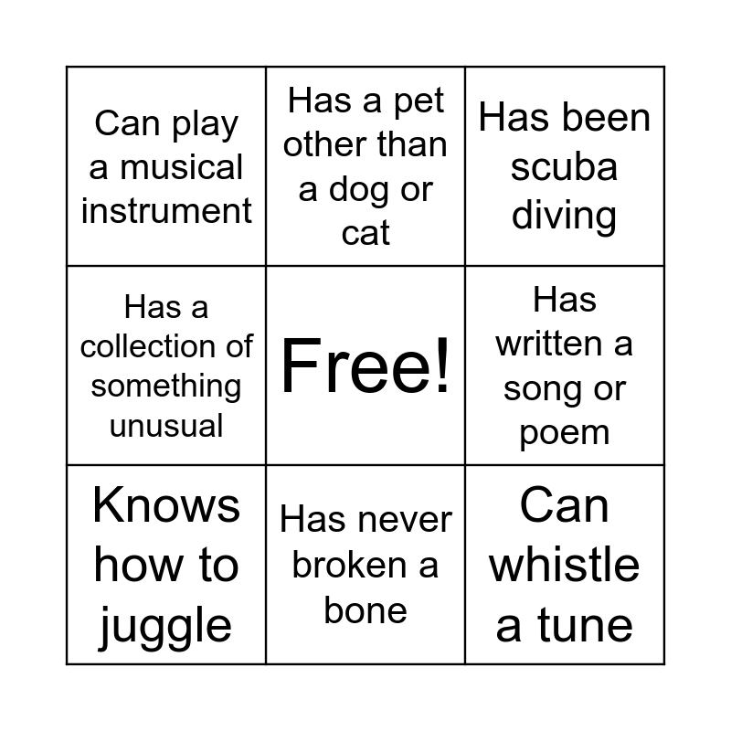 This bingo card has a free space and 8 words: Has written a song or poem, Has been scuba diving, Has a pet other than a dog or cat, Knows how to juggle, Can play a musical instrument, Can whistle a tune, Has a collection of something unusual and Has never broken a bone.
