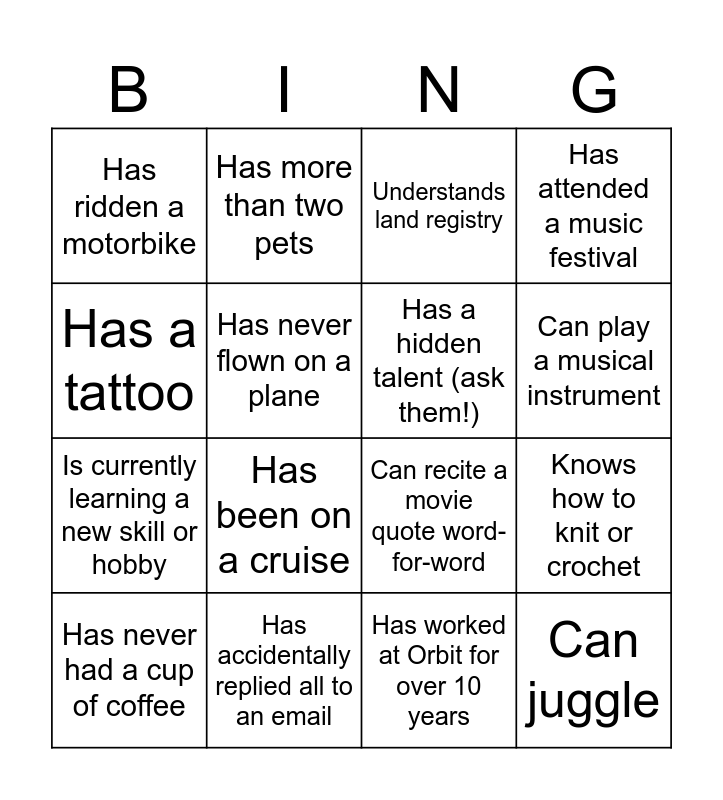 This bingo card has 66 words: Free!, Has broken a bone, Is left-handed, Has driven a tractor, Speaks more than one language, Has run a marathon or half-marathon, Has more than two pets, Has met someone famous, Can play a musical instrument, Is afraid of heights, Has been on TV or radio, Has the same birthday month as you, Has worked at Orbit for over 10 years, Has a tattoo, Is a twin or has twins in the family, Has never flown on a plane, Knows how to knit or crochet, Has ridden a motorbike, Has fainted in public, Is currently learning a new skill or hobby, Has been skydiving or bungee jumping, Can juggle, Has attended a music festival, Has worked in another country, Owns a vinyl record player, Can whistle with their fingers, Is a vegetarian or vegan, Knows how to change a car tyre, Has never had a cup of coffee, Can name all the planets in order, Has lived in more than three cities, Was born in a different country, Has been camping in the last year, Loves pineapple on pizza, Has binged a full TV series in one weekend, Still uses their childhood nickname, Has been in the same role for more than 5 years, Can recite a movie quote word-for-word, Has met a royal, Has completed a DIY project recently, Has a hidden talent (ask them!), Is currently watching a reality TV show, Has accidentally replied all to an email, Has more than three houseplants, Has completed a charity event, Loves horror films, Has been on a cruise, Prefers tea over coffee, Has a fear of birds, Has written a poem or song, Can do an impression or accent, Knows how to raise a task on Active H, Is a master negotiator, Has used an Ipad, Knows how to read a building lease, Can recite our "Keep it clear" policy, Someone you could ask for support around ASB, Someone you could ask for support around breach of tenancy, Understands land registry, Knows what aids and adaptations are, Knows what FRAs are, Knows what TORT means, Can list 4 items on the estate inspection checklist, Is emotionally intelligent, Has a growth mindset and Knows what an account marker is.