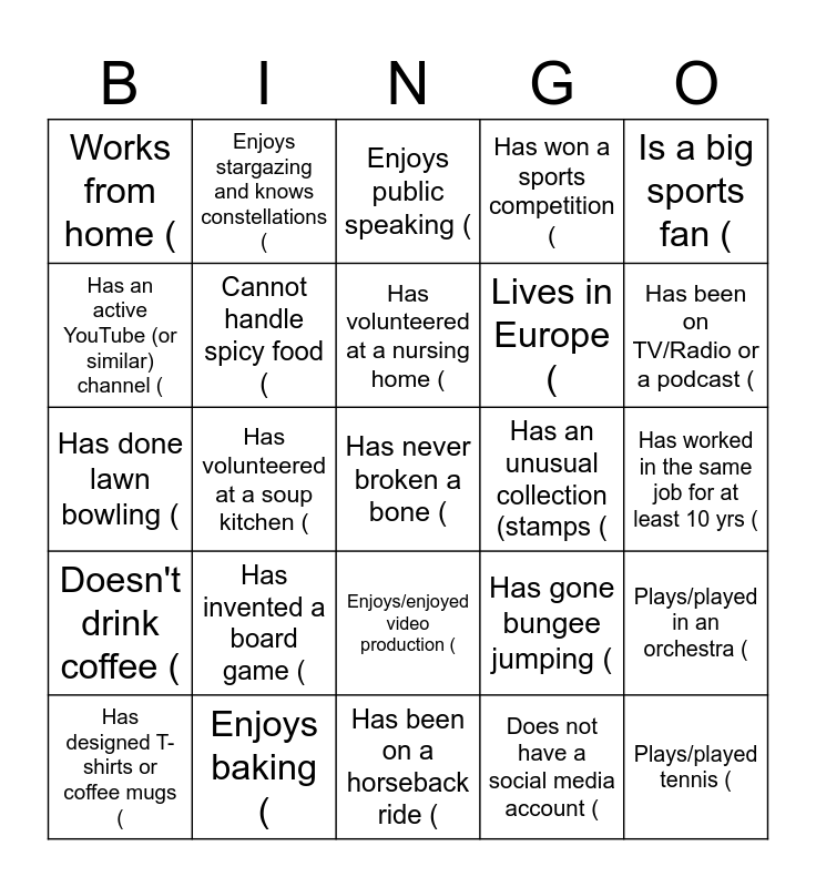 This bingo card has 121 words: Free!, Has done an overnight mountain expedition (, Has gone scuba diving (, Plays/played golf (, Has run a marathon or half marathon (, Plays/played soccer (, Has won a sports competition (, Plays/played in a band (, Plays/played in an orchestra (, Sings/sang in a choir (, Has perfect pitch (, Plays/played a stringed instrument (, Plays/played a guitar (, Plays/played the drums (, Enjoys/drawing or painting (, Enjoys/enjoyed photography (, Enjoys/enjoyed video production (, Has studied abroad (, Has competed in math competitions (, Speaks 3 or more languages fluently (, Has designed T-shirts or coffee mugs (, Enjoys public speaking (, Can cook Taiwanese food (, Enjoys/enjoyed gardening (, Drinks coffee black (, Doesn't drink coffee (, Enjoys baking (, Loves stinky tofu (, Loves Boba tea (, Has more than 200 followers in social media account (, Does not have a social media account (, Has volunteered at a soup kitchen (, Has volunteered at a nursing home (, Is left-handed (, Gets up before 6AM (, Prefers to be spontaneous (, Has tutored students (, Is very punctual (, Is a planner (, Owns a business (, Has a side hustle (, Practices Yoga or meditation (, Travels out of state (or country) regularly (, Loves going on cruises (, Gets seasick or carsick easily (, Can juggle or perform magic tricks (, Is great at puzzles and brain teasers (, Has an unusual collection (stamps (, coins (, etc.) (, Knows how to knit or crochet (, Has gone skydiving (, Has gone bungee jumping (, Plays/played an extreme sport (, Has a hidden talent unknown to most (, Has read more than 10 books this year (, Has met a celebrity in person (, Is an avid bird watcher (, Is a wildlife enthusiast (, Enjoys stargazing and knows constellations (, Has a pet (, Has played in a chess tournament (, Can recite a poem from memory (, Can whistle (, Has published a book (, Has an active YouTube (or similar) channel (, Plays/played ping pong (, Plays/played tennis (, Plays/played volleyball (, Has a PhD or Doctorate (, Has done lawn bowling (, Is an avid anime fan (, works/ worked for the US Government (, Is afraid of heights (, Is afraid of spiders (, Lives in Europe (, Does / has done martial arts (, Can make U-shape with tongue (, Enjoys working out (, Has never broken a bone (, Has invented a board game (, Works from home (, Has only had one job in their entire career (, Has earned a professional certification (, Changed majors more than once in college (, Did not pass driving test on 1st try (, Commutes via bicycle (, Is an early tech adopter (, Has worked in the same job for at least 10 yrs (, Has attended a live professional sporting event (, Has attended a live concert (, Has been on a camel ride (, Has been on a horseback ride (, Enjoys binge-watching shows/movies (, Enjoys outdoor hiking (, Enjoys scenic views (, Is passionate about eating healthy food (, Likes fast food (, Is a big sports fan (, Is afraid of snakes (, Has gone hunting (, Owns firearm(s) (, Has a food allergy (, Enjoys very spicy food (, Cannot handle spicy food (, Has done hang gliding (, Has gone surfing (, Has done water/jet-skiing (, Considers oneself a germaphobe (, Has grilled in the winter (, Enjoys home DIY (, Is addicted to his/her smartphone (, Has never been in a car accident (, Has never gotten a speeding ticket (, Enjoys ballroom dancing (, Has been on TV/Radio or a podcast (, Has done real outdoors camping (, Enjoys attending church (, Still reads physical newspapers (, Enjoys video games ( and Enjoys swimming and Plays/Played the piano.