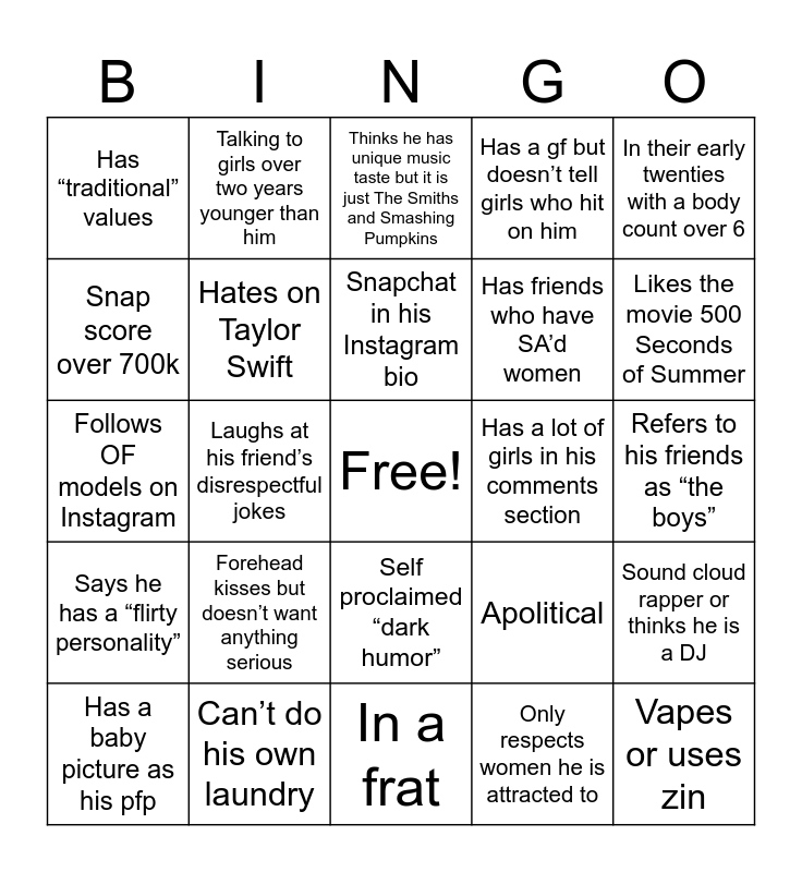 This bingo card has a free space and 24 words: Forehead kisses but doesn’t want anything serious, Can’t do his own laundry, Snapchat in his Instagram bio, Has a baby picture as his pfp, In their early twenties with a body count over 6, Has “traditional” values, Snap score over 700k, Talking to girls over two years younger than him, Has a lot of girls in his comments section, Self proclaimed “dark humor”, Has friends who have SA’d women, Follows OF models on Instagram, Apolitical, Sound cloud rapper or thinks he is a DJ, Hates on Taylor Swift, Only respects women he is attracted to, Refers to his friends as “the boys”, Thinks he has unique music taste but it is just The Smiths and Smashing Pumpkins, Likes the movie 500 Seconds of Summer, Laughs at his friend’s disrespectful jokes, Vapes or uses zin, Says he has a “flirty personality”, Has a gf but doesn’t tell girls who hit on him and In a frat.