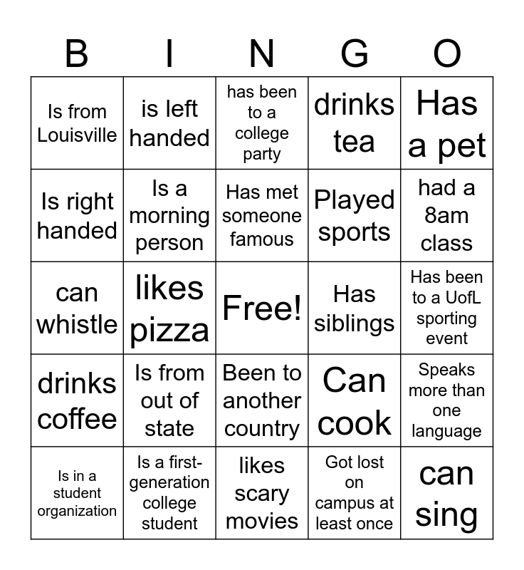 This bingo card has a free space and 24 words: Is from out of state, Is a first-generation college student, Has met someone famous, Is in a student organization, Has a pet, Is from Louisville, Is right handed, is left handed, Has siblings, Been to another country, Played sports, can whistle, Can cook, Speaks more than one language, Is a morning person, Got lost on campus at least once, Has been to a UofL sporting event, has been to a college party, had a 8am class, likes pizza, can sing, drinks coffee, drinks tea and likes scary movies.