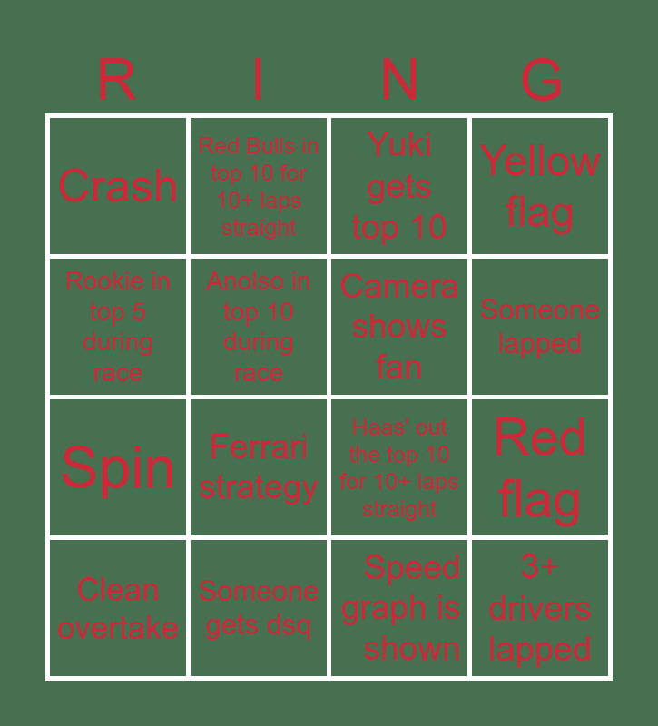 This bingo card has 16 words: Clean overtake, Someone gets dsq, Yuki gets top 10, Yellow flag, Rookie in top 5 during race, Red Bulls in top 10 for 10+ laps straight, Haas' out the top 10 for 10+ laps straight, Red flag, Crash, Anolso in top 10 during race, Speed graph is shown, Someone lapped, Spin, Ferrari strategy, Camera shows fan and 3+ drivers lapped.