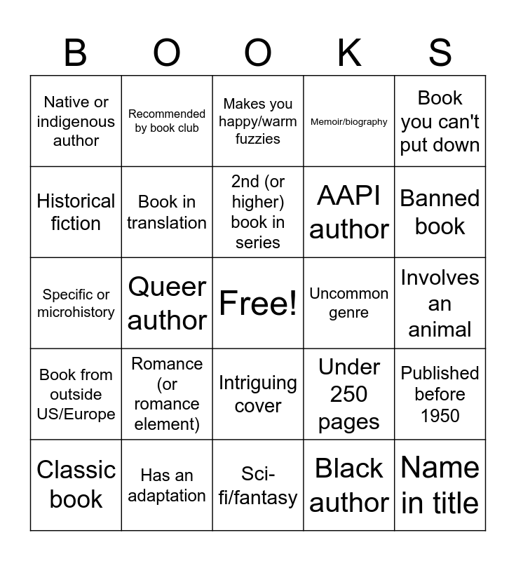 This bingo card has a free space and 49 words: Colour in title, Name in title, Punctuation in title, Sci-fi/fantasy, Romance (or romance element), Nonfiction, Recommended by book club, Book someone else hated, Historical fiction, Setting you want to travel to, Book in translation, Memoir/biography, Published before 1950, Under 250 pages, On your TBR for 3+ years, Book you got for free, 2nd (or higher) book in series, Uncommon genre, Uncommon format (i.e. audiobook, ebook), Book you can't put down, Queer author, Black author, Native or indigenous author, AAPI author, Award-winner, Banned book, Classic book, Quote/allusion in title, Intriguing cover, Book from outside US/Europe, Author w/ same first name OR first two letters of your last name, Takes place in your state, Has pictures, Mystery, Has an adaptation, Book that intimidates or scares you, Over 500 pages, X of Y title (ex. The Colour of Magic, A Court of Thorns and Roses), Involves an animal, Debut book, Disability representation, Latinx author, Beautiful prose, Makes you laugh, Specific or microhistory, Makes you happy/warm fuzzies, Involves school/education, Old favourite and Children's/YA book.