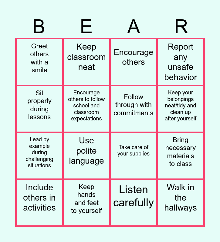 This bingo card has 36 words: Wait your turn to speak, Help others in need, Take care of school property, Follow through with commitments, Organize your desk, Walk in the hallways, Keep your belongings neat/tidy and clean up after yourself, Follow playground rules, Sit properly during lessons, Complete all assignments in a timely manner, Bring necessary materials to class, Report any unsafe behavior, Listen to peers during conversations, Keep hands and feet to yourself, Use polite language, Greet others with a smile, Offer help to classmates, Use positive language, Include others in activities, Encourage others, Listen carefully, Raise hand to ask questions, Follow all instructions, Stay on task, Complete work with minimal reminders, Keep classroom neat, Take care of your supplies, Take care of your supplies, Lead by example during challenging situations, Encourage others to follow school and classroom expectations, Follow school and classroom expectations, Arrive to class on time, Be prepared with all materials, Be ready for lessons, Stay on task with minimal reminders and Try your best even if it’s hard.